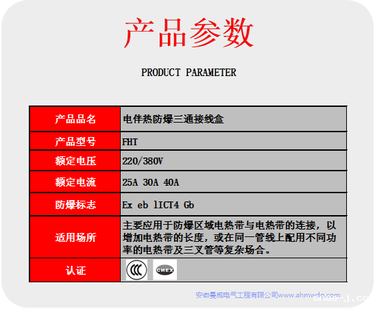 防爆三通接线盒(俗称T型接线盒)。它主要应用于防爆区域电热带与电热带的连接,以增加电热带的长度,或在同一管线上配用不同功率的电热带及三叉管等复杂场合,其外壳为DMC塑料制成。
