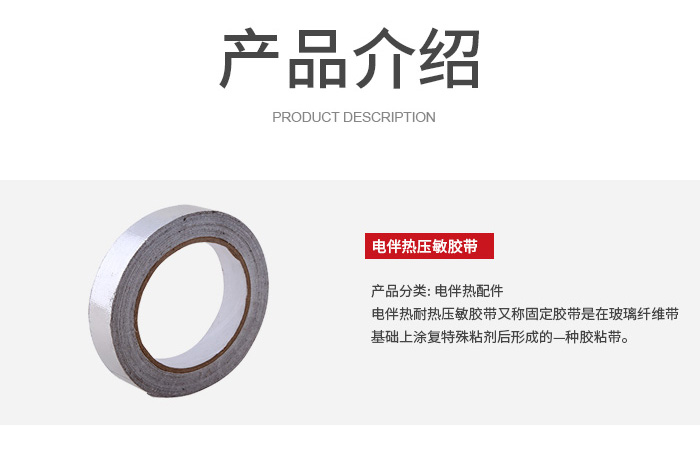 作用是辅助固定和密封防护,常用来固定铝箔胶带的搭接处、填补缝隙,或在伴热带安装完成后,对局部位置进行加固;部分耐温型压敏胶带还可用于低温环境下的临时固定,兼具一定的绝缘、防潮效果。