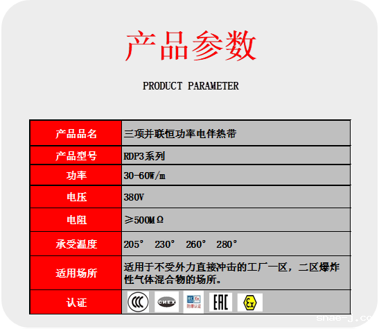 三相并联恒功率电伴热带系列(RDP3)产品名称:三相并联恒功率电热带型号:RDP产品规格:6.3*9.5mm温度范围:0-120℃耐温温度:205℃标准功率:30 40 50 60w/m常用电压:3