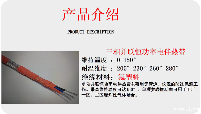 三相恒功率电热电缆的原理基本相同,不同之处是单相带采用单相供电,三相恒功率电热带采用三相三角形供电,三相带除有单相加热电缆的特点外,特别适用于长距离、大口径管道的伴热和保温,可用于工厂一区、二区爆炸性气体混合物T3组场合。