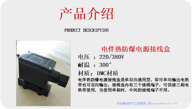 电伴热带电源接线盒电伴热带防爆电源接线盒用于电源线与电热带在防爆区域的连接。一般固定在管道上。与电热带配套后适用于工厂一区、二区爆炸性气体混合物T4组场使用。防爆电源接线盒即可单向输出,又可双向输出